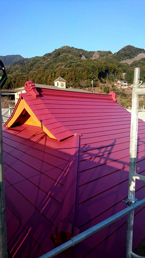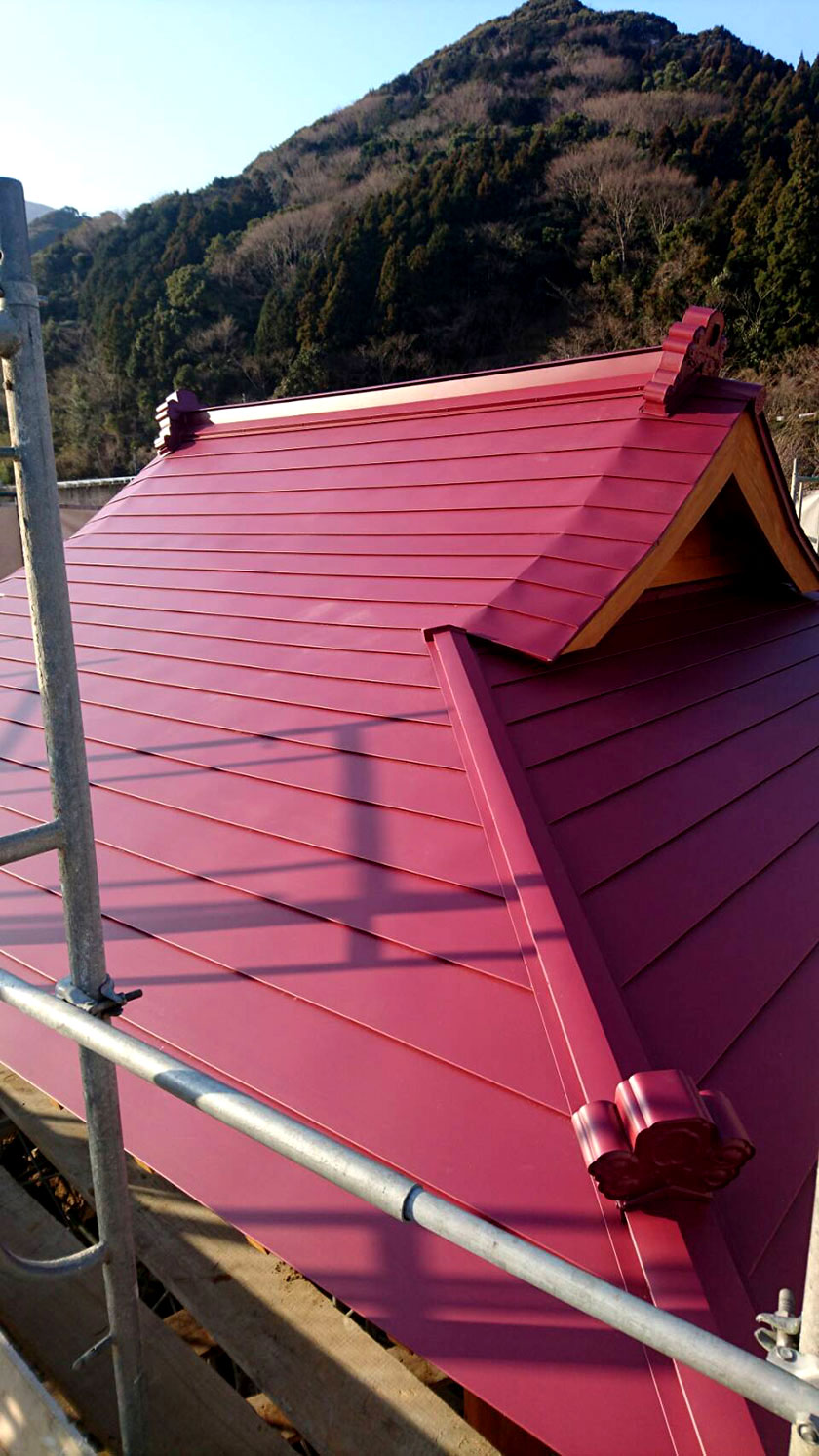 小学校の土俵屋根をガルバリウム銅板カラー横葺きにして施工、棟端部、隅部分にも鬼飾りを用い和のテイストを活かしました。