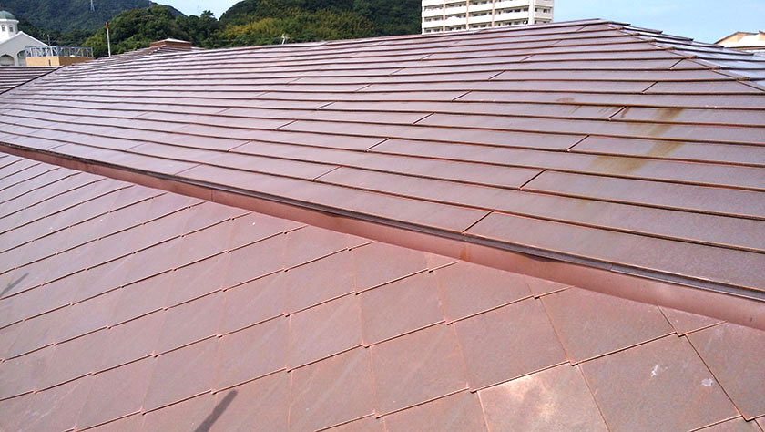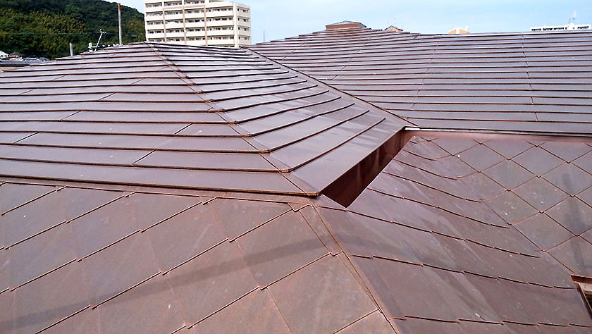 ここ最近の銅板工事としては珍しい葺き上がりとなりました。雨樋から棟頂部まで全て銅板で納めました。